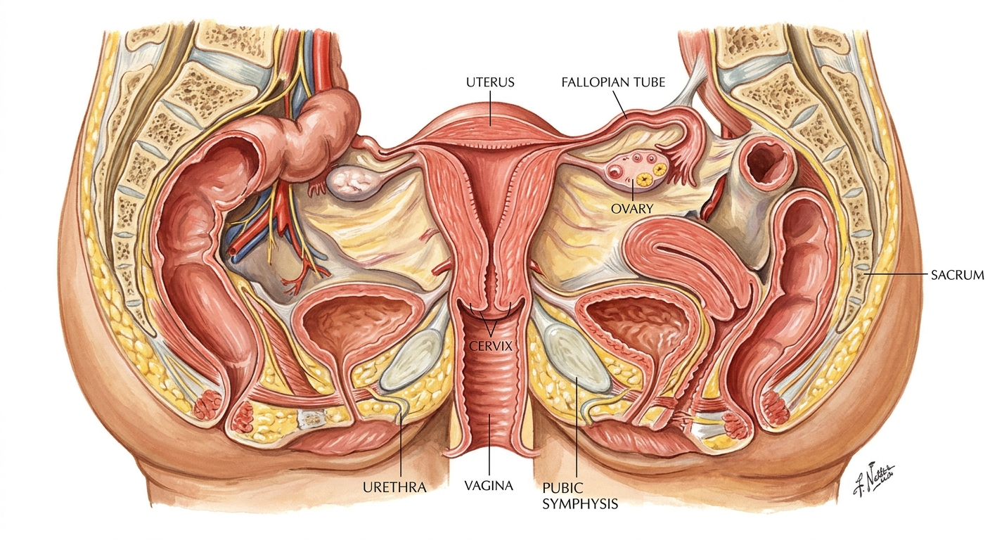 !Female pelvic anatomy cross-section in Netter illustration style